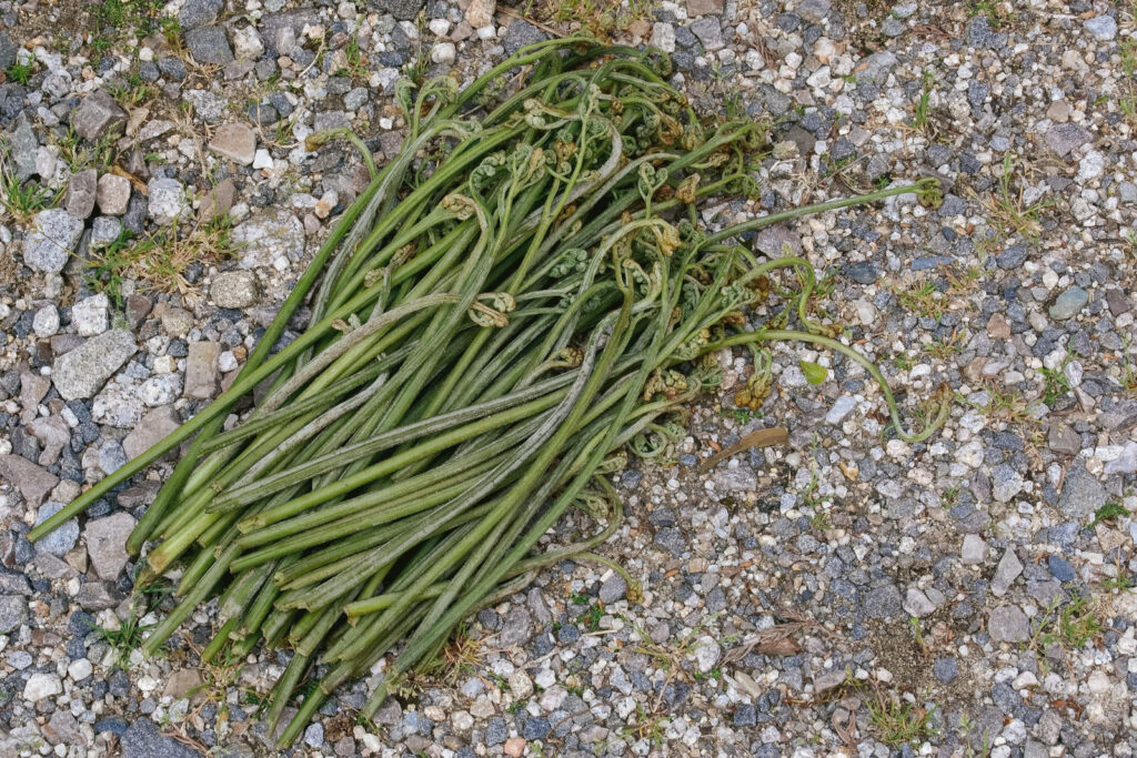 山菜の定番中の定番。先端がくるっと丸まった状態のものを選んで、根元から手で折るように採ります。柔らかいところだけ折れるので、その部分が食べごろのサインです。